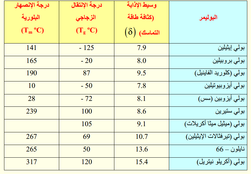 جدول (1): تأثير كثافة طاقة التماسك على بعض الخواص الفيزيائية لبعض البوليمرات المهمة صناعياً