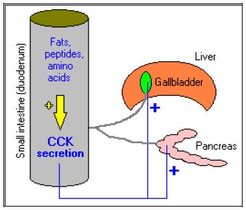 يحفز هضم البروتينات ، كان يدعى سابقا Pancreozymin نتج من بعض الخلايا الطلائية في الطبقة المخاطية للامعاء الدقيقة ويفرز الى الاثنى عشري Duodenum الذي يعد القطعة الاولى من الامعاء الدقيقة مؤديا الى اطلاق الانزيمات الهاضمة وعصارة الصفراء من البنكرياس وكيس الصفراء