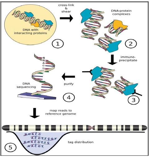 طريقة للكشف عن التداخل بين البروتينات وDNA التي تكون اساسية للعديد من الفعاليات الحيوية . وتهدف لتحديد فيما اذا كانت البروتينات ترتبط الى تواليات محددة من DNA كما في عوامل الانتساخ في الممهدات او مناطق اخرى والتعريف ب Cistromes وكذلك تحديد المواقع في الجينوم التي لها علاقة بتحوير الهستونات اي لتحديد محورات الهستونات وتوجد طريقتين N-ChIP تستعمل الكروماتين الطبيعي و X-ChIP التي تستعمل الكروماتين المرتبط Cross-Linked Chromatin .