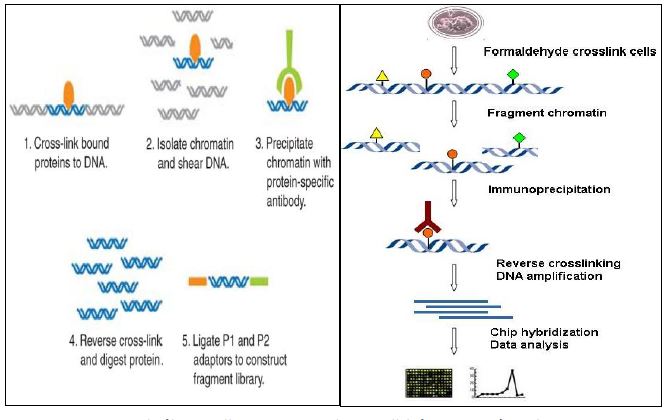 الاولى تستعمل لدراسة البروتينات التي لها ارتباط قوي ومباشر مع DNA مثل الهستونات. اما الاخرى فتستعمل لدراسة البروتينات التي ترتبط الى DNA بشكل عابر او مؤقت لذلك احتاجت الى تثبيت هذه الارتباطات بحيث يمكن الحصول على DNA المرتبط بالبروتين المعني ، لذلك تثبت الخلايا في حالة X-ChPI بالفورمالديهايد لتثبيت DNA مع البروتينات المرتبط اليها ، ثم تحلل الخلايا ويقطع DNA باستعمال الامواج الصوتية الى قطع بين 1000- 500قاعدة ، ثم ترسب قطع DNA المرتبطة بالبروتينات باستعمال اجسام مضادة خاصة بالبروتين المعني المرتبط الى DNA وتنقى الاخيرة . ويفك ارتباط DNA من البروتين باستعمال البروتيزات ، ويؤخذ DNA ويحدد تواليه او يهجن باستعمال Microarray ويقارن مع DNA غير مرتبط الذي يستعمل كمعاملة سيطرة ثم يمكن تحديد مناطق ارتباط DNA .