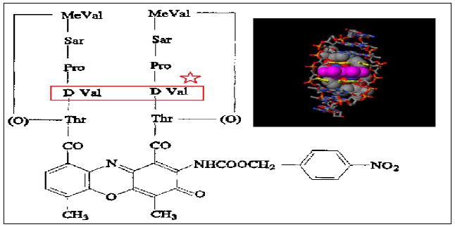 وتختلف مشتقات المضاد في المجاميع او الحزيئات التي يمكن ان تحل محل D-Val، وتنتج من قبل Streptomyces chrysomallus وS. antibioticus وقد أنتج حوالي 30 نوعاً ، وآلية عملها تكون بانحشارها في أشرطة DNA خصوصاً في المناطق الغنية ب GC كما موضح في الشكل اعلاه (الجانب الايمن) مؤدية إلى غلق عمليات تضاعف المواد النووية وبذلك فهي سامة جداً لذا يكون استعمالها محدد جداً ، ولكن يستعمل المضاد Actinomycin C معالجة بعض الأورام السرطانية تحت سيطرة مشددة.