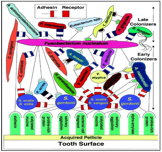 عملية اساسية لانتاج الاغشية الحيوية الحاوية لاكثر من نوع وجنس من البكتريا ، اذ يمكن ان يحصل تعرف Crosstalk Cell-to-Cell لخلايا مختلفة من الناحية الوراثية ، ويكون ذلك باستعمال جزيئات خاصة مثل Lectins على احد الخلايا ليتكامل مع مستلم للكربوهديرات على خلايا اخرى ، كما يحصل في البكتريا المستوطنة في الفم وكذلك الاغشية المخاطية ، اذ ان الخلايا المقيمة الاولى تستقبل الخلايا القادمة الجديدة وتتجمع معها ، والظاهرة توجد في العصيات اللبنية المستعملة كاحياء علاجية اذ تظهر في العصيات اللبنية المهبلية ظاهرة التجمع وهي ارتباط الاحياء الممرضة على سطوح العصيات وتكوينها تجمعات كبيرة يمكن ان تطرد الى الخارج ، كما ان عملية التجمع هذه تكون مهمة في استعادة الفلورا الطبيعية اذ تخلق بيئة موضعية حول الممرضات التي يزداد فيها تركيز المواد المثبطة التي تنتجها العصيات كما موضح في الاتي :