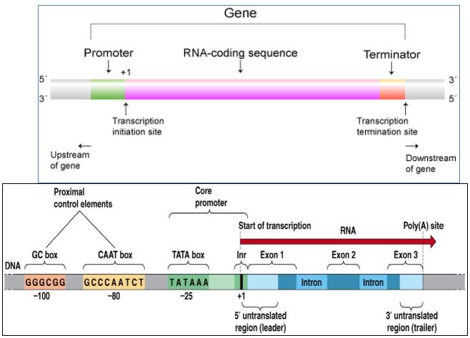 الجينات التي تشفر للبروتينات وتكون حاوية على الممهدات او المشجعات Enhancers في حالة الخلايا حقيقية النواة وغيرها من المقومات التي تحدد أي منطقة من الجين سوف يتم انتساخها ثم ترجمتها ، وتختلف في الخلايا بدائية النواة عن تلك الموجودة في حقيقية النواة