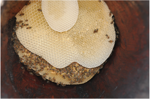 شكل يبين بناء الأقراص الشمعية بناءً طبيعيًا داخل الخلايا البلدية مع ترك ممرات لسير النحل على الجوانب وفي الأسفل.