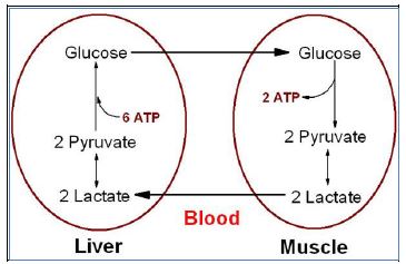 ويعود الكلوكوز المتكون مرة ثانية الى الخلايا العضلية عن طريق الدم ويتم تحلله مرة ثانية بعملية تحليل الكلوكوز وهكذا فأن الكلوكوز وحامض اللاكتيك يدوران بين العضلات والكبد بدورة تدعى دورة كوري وباختصار فأن الدورة عبارة عن دخول الكلوكوز الى العضلة وخروج حامض اللاكتيك منها بينما يأتي أو يدخل الكبد حامض اللاكتيك ويخرج على هيئة كلوكوز وهكذا تستمر الدورة .