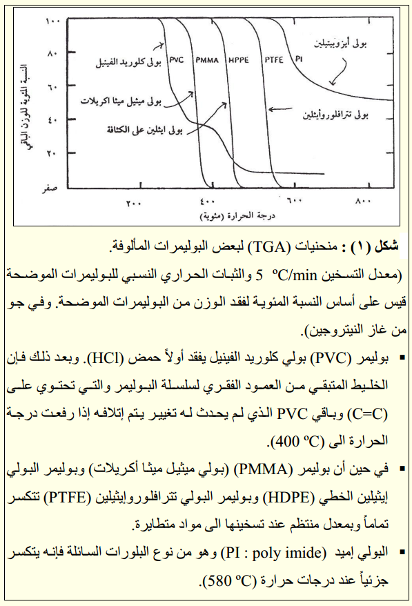 *وكذلك تفيد في إعطاء فكرة عن تسلسل المكونات في البوليمرات المختلطة ويوضح الشكل (1) نتائج فحص عينات من بوليمرات مختلفة بطريقة (TGA).