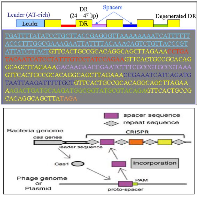 - وجود Direct Repeats) DR) وفواصل ، و DR تمتد الى حوالي 21 قاعدة ، تفصل بينها فواصل باطوال متشابهة ، وتكون التتابعات المباشرة (DR) غير ثابتة لذا تسمى Degenerated DR .