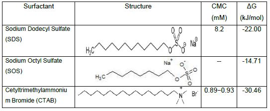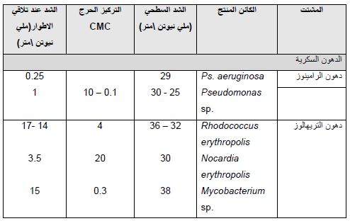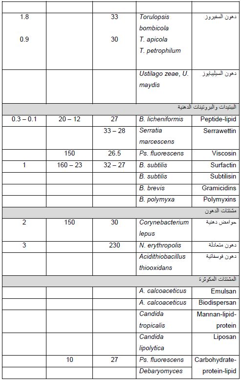 وتنتج العديد من الاحياء المختلفة انواع مختلفة من المشتتات ضمن أصناف كيماوية مختلفة كما موضح في الجدول التالي وتكون قيم CMC لها مختلفة وتؤثر في الشد السطحي كما في الاتي :