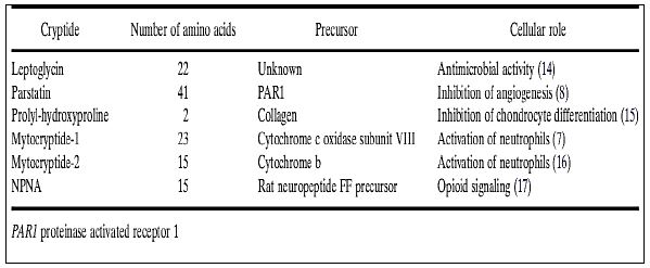 ببتيدات فعالة حيويا تدرس ضمن حقل Cryptomics ، لها صفات علاجية لا توجد في البروتينات التي تشتق منها ، تعمل في نقل الاشارات العصبية وتقديم المستضدات والتفاعلات الالتهابية ، تعمل في تنظيم الجينات في النواة عند انتقالها من السايتوبلازم الى النواة من امثلتها Parstatin . تشتق من بروتينات معروفة مثل الهيموغلوبين والكولاجين وغيرها . تقسم الى نوعين ، الاول : لا يمت بصلة الى سوابقه ، والثاني تمت ببعض الصلة لسوابقها ، وهناك نوع ثالث يحضر خارج الانظمة الحية وربما لا يوجد في الانظمة الحية ، البعض منها موضح في الاتي :