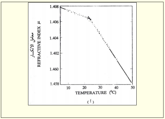 لقد وجد بأن معامل الانكسار (refractive index) للبوليمر يتغير مع درجة الحرارة ويكون هذا التغير كبيرا بالنسبة للبوليمرات عند درجة الانتقال الزجاجي. ويبين الشكل ادناه تغير معامل الانكسار مع درجة الحرارة بالنسبة لبلولي (خلات الفاينيل) (vinyl acetate) Poly.
