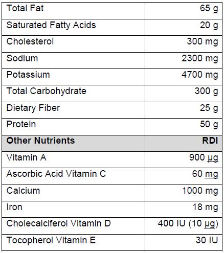 كمية او مستوى الاغذية التي تعد كافية لمتطلبات الجسم بمستوى 97-98 % للاشخاص الاصحاء . وتشمل الاغذية البروتينات والدهون والكربوهيدرات والفيتامينات ومكونات الاغذية الاخرى مثل الالياف والجدول الاتي يوضح بعضها للاشخاص العاديين :
