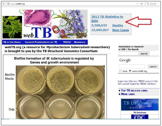 ومثال اخر على قواعد البيانات او موقع WebTB او الذي يسجل على مدار الساعة الحالات الموثقة للاصابة الوفيات في العالم كما في الاتي :