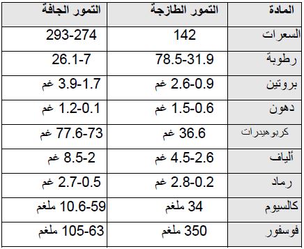 وتختلف النسب في التمور الطرية عنها في التمور الجافة بعض الشيء وان كانت عملية التجفيف لا تؤثر بشكل كبير لان نسبة الماء قليلة في الثمار الناضجة ويوضح الجدول التالي نتائج بعض الدراسات على التمور الطازجةوالمجففة ( الجزء المأكول من الثمرة ) ، القيمة الغذائية لكل 100 غرام .