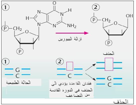 إزالة قاعدة نتروجينية او امتداد من النيوكلوتيدات وهذا ما يسمى بطفرات الشطب او الحذف ، والامتدادات المحذوفة قد تكون جين واحد او عدد من الجينات وعندما تكون الامتدادات كبيرة تسمى العوامل المؤثرة ب Clastogenic Agents ، وفي حالة التأثير على مستوى القواعد النتروجينية فهذه قد تكون إزالة شفرة واحدة او قاعدة نتروجينية واحدة من الشفرة . ومن أفضل الأمثلة عليها إزالة البيورينات وقد تم تقدير ان هناك حوالي 500 قاعدة بيورينية اما أدنين او كوانين يمكن ان تزال من الجينوم/يوم ويكون ذلك نتيجة لتأثير الحرارة او غيرها من العوامل . وتتم اما بالفلق ألتحللي للارتباط N-glycosyl Linkage للسكر منقوص الأوكسجين مع نتروجين الكوانين في الموقع 9 وينتج عنه سكر بدون بيورين وبدوره يؤدي الى عملية الحذف في الدورة القادمة من التضاعف ان لم يتم إصلاحها كما موضح في الشكل الاتي :