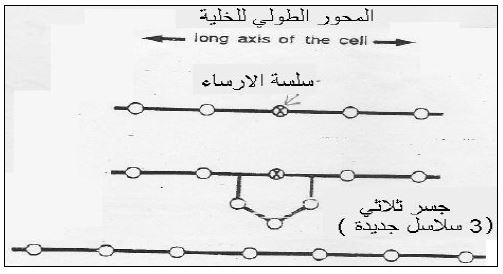 السلسلة المركزية من مكوثر الجدار الخلوي البكتري التي تحاط بسلاسل من الجانبين والأمام عند نمو الجدار الخلوي واستطالة الخلايا تحل ثلاثة سلاسل محلها ثم تحل محل السلسلة المركزية سلسلة مركزية جديدة أثناء النمووافتراض وجود سلسلة الارساء يقع ضمن افتراض 1 لــ 3 الذي يفسر عملية نمو الخلايا، والافتراض موضح في الشكل الآتي :