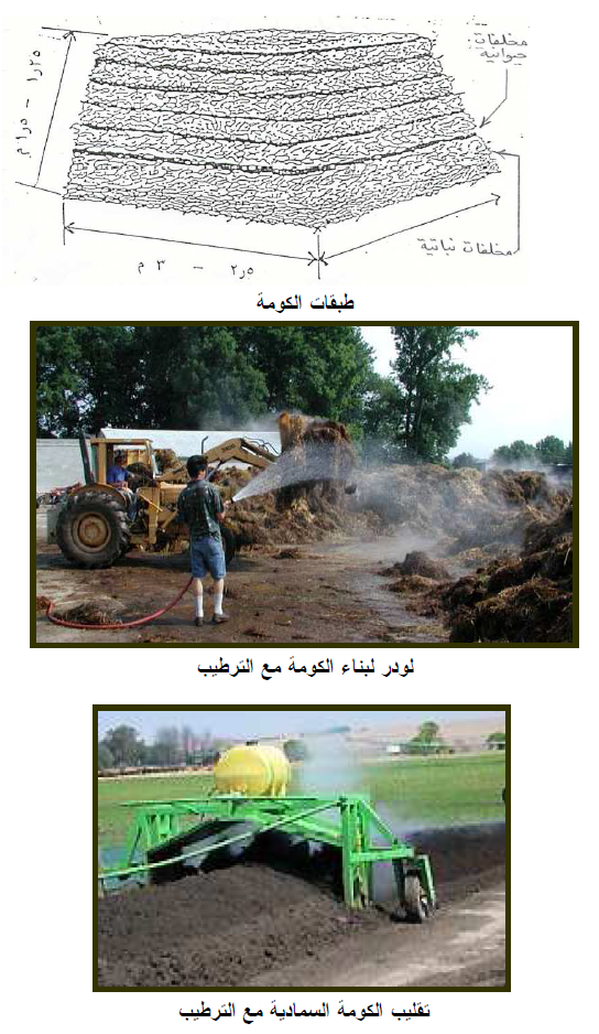 ٣- تبنى الكومة في طبقات متتالية: حيث توضع طبقة من النواتج الثانوية للمحاصيل الزراعية (المخلفات النباتية) عرض ( ٢- ٣م) وسمك ( ٥٠ -٦٠ سم ) ثم توضع فوقها طبقة من المخلفات الحيوانية بسمك ( ١٠-١٥ سم) أو ترش بخليط من الأسمدة النيتروجينية والفوسفاتية أو اللقاحات الميكروبية ويداس عليها بأقدام العمال لضغطها وتقليل الحجم. ويتم تكرار هذه العملية مع تناوب طبقات المخلفات مع الرش بالماء والضغط حتى يتم كمر كل المخلفات لارتفاع ( ١.٥-٢ متر) ثم ترش من الخارج.