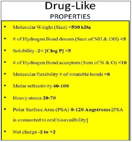 وهناك بعض المؤشرات الرقمية التي تستعمل للدلالة على مدى مشابهة المادة للادوية مثل الوزن الجزيئي، LogP ، عدد H- bond Donors و عدد H-bond Acceptors وهذه تساعد في ابعاد العديد من المواد من مجال الاستعمال كأدوية ، ومن هذه المواصفات المذكورة ادناه :