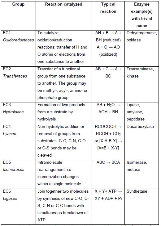 وتمثل محتويات الجدول المجاميع الرئيسة ، والتي تلحق بها ارقام اخرى لغرض التعريف الادق بالانزيم ، وبواسطة هذه الارقام يمكن البحث عن الانزيمات في مختلف قواعد البيانات .
