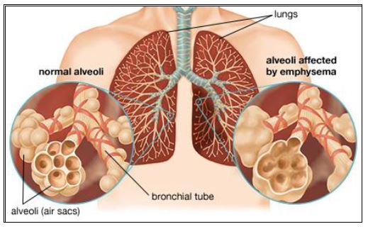 احد امراض احتقان الرئة COPD) Chronic Obstructive Pulmonary Diseases ) الذي يؤدي الى انتفاخ الاكياس الهوائية في الرئة ، وتنتفخ الحويصلات عند نهايات القصيبات نتيجة لتكسر الاوعية الدموية وهذا يعني قلة المساحة التي يتم فيها تبادل الاوكسجين في الدم مع ثنائي اوكسيد الكاربون . واكثر اسبابها التدخين الذي يصل الى 90 % من الحالات خاصة في الاشخاص اللذين عندهم استعداد وراثي ، فضلا عن وجود اسباب اخرى تساعد في نشوء المرض مثل انخفاض وزن الجسم واضطرابات الجهاز النتفسي في الطفولة ، وتلوث الهواء والتلوث المهني واستنشاق المركبات المؤذية .
