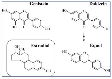 فأنزيمات الامعاء تزيل السكر وتبقى هذه المركبات في الامعاء التي يسهل امتصاصها. وهذه المركبات تتايض اكثر لتكوين ODEMA) O- desmethylangolensin) .و Equol ينتج من Daidzin. وله علاقة بحدوث سرطان الثدي في مراحل قبل وبعد سن اليأس (Postmenopause و Premenopause) أي له علاقة بالنسق الهرموني في النساء قبل سن اليأس . وفلورا الامعاء لها علاقة وثيقة بتأيض Daidzin الى المركب الذي له علاقة بمنع سرطان الثدي ، ولذلك فأن وجوده يعد احد الواسمات التي تشير الى منع حدوث السرطان بواسطة بكتريا الامعاء ، وبما ان الغذاء يؤثر في فلورا الامعاء فانه سيؤثر في كميات المركب.
