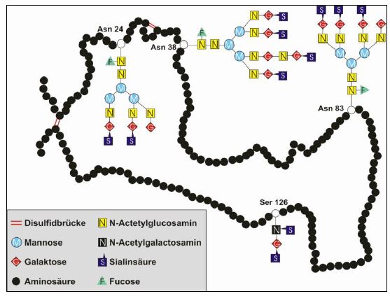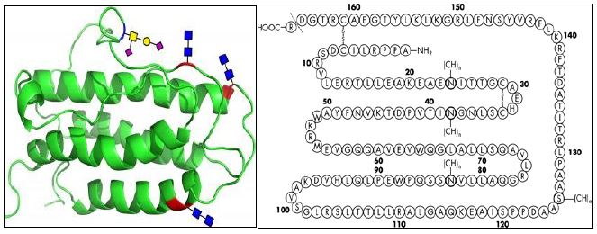 أحد البروتينات العلاجية المهمة وهو سايتوكاين سكري Glycosylated Cytokine الذي يساعد في تنظيم أعداد كريات الدم الحمر في الدم وجعلها في حالة مستقرة ، ويرتبط البروتين الأساسي بال Glygan في مواقع ثلاثة 24 ،83 ،38من الحوامض الأمينية التي يحويها والكلايكان ليس ضروريا لفعالية البروتين خارج الأنظمة الحية ولكنه في داخل الجسم يحدد العمر النصفي للبروتين، وقد تم نقل الجينات المسئولة عن البروتين إلى عالق خلايا نبات التبغ وأمكن التعبير عنه ولكن يبدو أن إفرازه في الجسم يحتاج إلى توالي خاص . وهو أحد البروتينات العلاجية التي تهدف التقنيات الحيوية إنتاجه لاستعماله للأشخاص المحتاجين إليه.