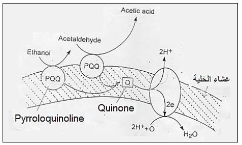 تحويل الكحول الاثيلي إلى حامض الخل والذي يعد الأساس في عمليات إنتاج الخل، ويكون تحويل الكحول الاثيلي عن طريق الاستيالديهايد كمركب وسطي، وسلسلة المكونات التي يشملها تأكسد الكحول الاثيلي تكون مرتبطة بالأغشية الخلوية للبكتريا Acetobacter المنتجة للخل كما موضح في الشكل الآتي :
