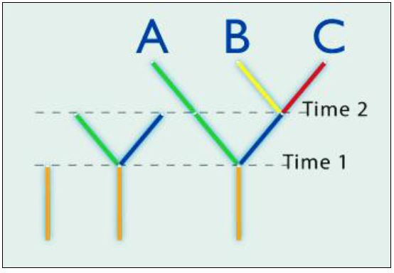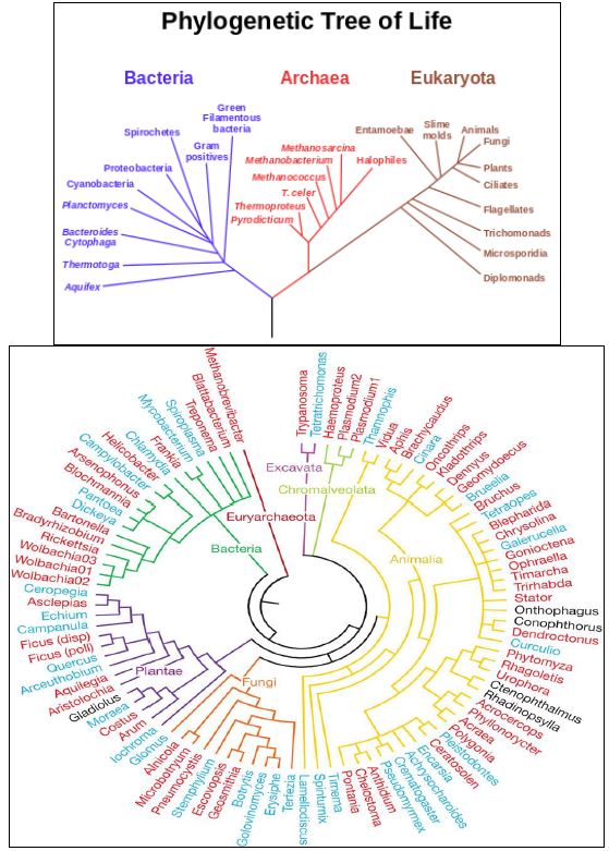 العملية التي تتغير بواسطتها الاحياء والمجتمعات عبر الزمن وتؤدي الى تمييزها وتقسيمها الى فروع، وقد تندمج هذه الفروع وتنتهي بالانقراض . وتوضح العملية باشجار العلاقات التطورية والذي يمثل فيها كل مكان موقع لمجموعة من الاحياء المختلفة وتعتمد على تواليات DNA او البروتينات التي طالتها احداث التطور