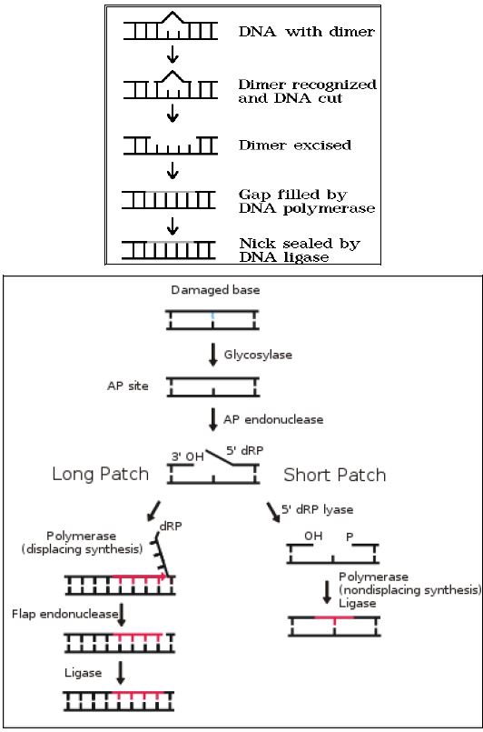 نظام اصلاح مباشر يشارك في اصلاح الضرر الناتج من عدة عوامل ويمكن ان يقوم باصلاح العطب الناتج من الاشعة فوق البنفسجية وعندها يسمى نظام اصلاح ضرر الاشعة فوق البنفسجية ب Nucleotide Excision Repair وفيه يقوم احد الانزيمات القاطعة الداخلية Correndonuclease (انزيم القطع الداخلي المصحح) والذي يمكن ان يميز مزدوجات الثايمين ويثلم الشريط عند النهاية ' 5 . ويتكون الانزيم من عدة وحدات ثانوية هي منتجات الجينات uvrD، uvrC، uvrB، uvrA ، والبروتينات يتداخل بعضها ليكون جسيم الإصلاح .