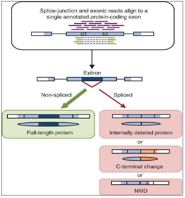 مناطق انترون تشبه الاكسون توجد ضمن الاكسونات المشفرة للبروتينات ، وازالتها او بقاءها يؤدي الى تعقيد المكنون البروتيني ومفهومه وبالتالي يزيد من تنوع الانماط المظهرية ، والكلمة منحوتة من Intron و Exon استعملت لاول مرة عام 2015 ، وقد اكتشفت في نبات رشاد الصخرArabidopsis thaliana وسميت Exonic Introns. وهي تمثل الانترونات التي يتم الاحتفاظ بها ولا تفلق او تزال واغلبها موجودة في رشاد الصخر والانسان ، وتمثل مضاعفات الثلاثة . حذفها يؤدي الى اضطراب دومينات البروتين والمناطق غير المرتبة ، فضلا عن اضطراب بعض التحويرات التي تجري على البروتينات بعد الترجمة وبالتالي تؤثر في وظيفة البروتين .