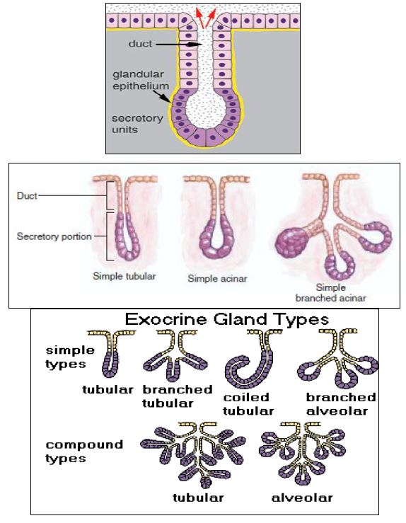 الغدد التي تفرز مكوناتها الى السطح وهي مكونة من الخلايا الطلائية ، ويكون الافراز عبر قنوات ، مثل الغدد العرقية او اللعابية والمخاطية وغيرها . وتصنف وفق تركيبها
