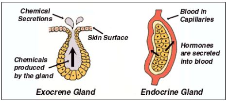 وتفرق عن الغدد الصماء Endocrine التي ليس لها قنوات وتختلف بعدد من المواصفات التي تختلف مدة تاثير منتجاتها في حالة انتاج الهرمونات ومدة الاستجابة لها .