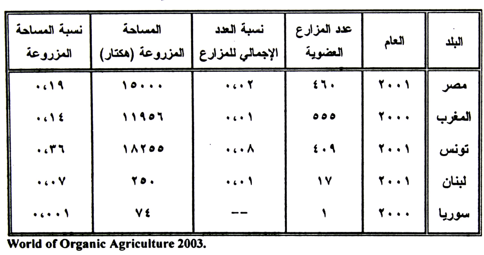 وتمتاز البلدان الواقعة على حوض البحر المتوسط، خصوصا دول المغرب العربي، بميزة نسبية تتمثل في قربها من الأسواق الأوربية مما يسهل عمليات التصدير والشحن خصوصا بالنسبة للمنتجات العضوية الطازجة. وفيما يلي جدول رقم (۲) يوضح بعض الأرقام الإحصائية عن الزراعة العضوية في بعض الدول العربية: