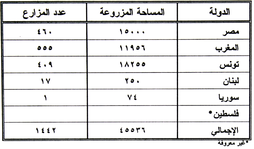 الجدول رقم (1) يوضح أن المساحة الإجمالية المسجلة طبقا للدراسات السابقة بلغت 45536 هكتار فقط موزعة علی 5 دول وعدد 1442 مزرعة وهذه المساحة تعتبر ضئيلة للغاية إذا ما قورنت بباقي الدول أو كنسبة من المساحة المنزرعة بالعالم العربي.