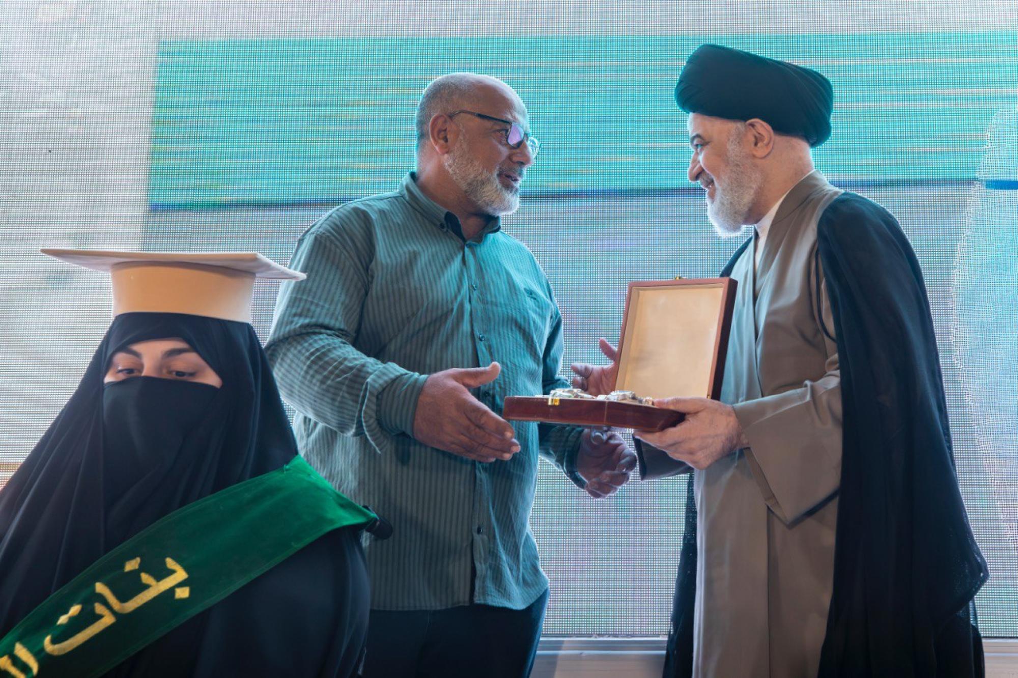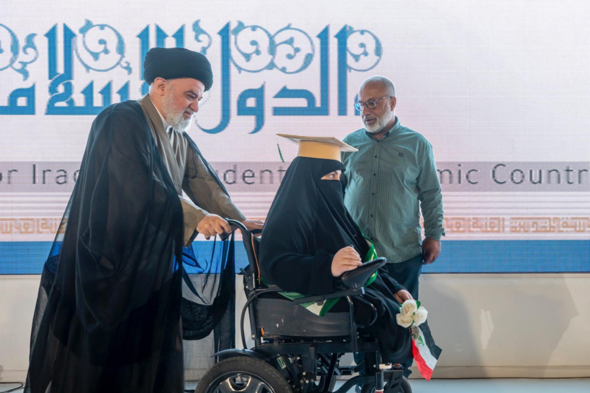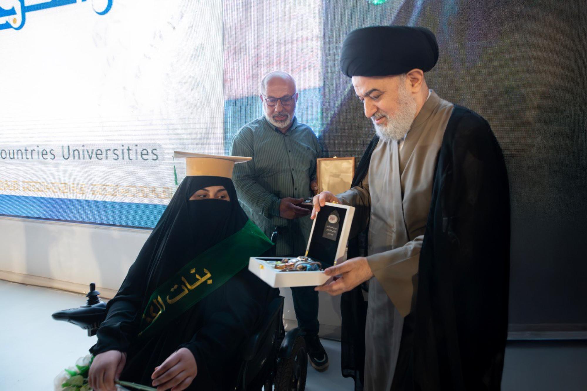 كرّم المتولي الشرعي للعتبة العباسية المقدسة سماحة العلّامة السيد أحمد الصافي الطالبة المتخرّجة زهراء حيدر من ذوي الهمم، ضمن فعاليات الحفل الختامي لتخرّج طالبات الجامعات العراقية والدول الإسلامية (دفعة بنات الكفيل التاسعة). ونظّمت الحفل شعبةُ مدارس الكفيل الدينية النسوية التابعة لمكتب المتولّي الشرعيّ للشؤون النسوية في العتبة المقدّسة، تحت شعار (من نور فاطمةَ -عليها السلام- نُضيءُ العالَم)، بمشاركة 5 آلاف طالبةٍ من مختلف الجامعات العراقية، وعددٍ من الدول العربية والإسلامية. وجاء التكريم بهدف تقديم الدعم المعنوي للخريجة التي تمثّل رسالة حيّة إلى الجميع بأنّه لا شيء مستحيل، وأنّ كلّ عائقٍ يُمكن أن يكون خطوةً نحو الصعود في سلّم النجاح.