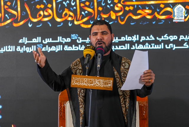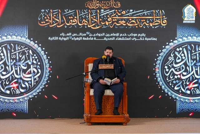 لتجديد عهد الولاء والوفاء للمحدثة العليمة السيدة فاطمة الزهراء "عليها السلام"، ولإحياء مناسبة ذكرى شهادتها الأليمة، تجسيداً لقول إمامنا جعفر الصادق "عليه السلام": (أحيوا أمرنا رحم الله من أحيا أمرنا)، أقام موكب خدّام الإمامين الجوادين "عليهما السلام" مجالس العزاء والتأبين، في رواق سيدنا عبد الله بن عبد المطلب "عليه السلام"، حيث استضاف المجلس خطيب المنبر الحسيني سماحة الدكتور السيد صفاء الفحام ليتحف الحضور بمحاضراته الدينية في بيان المآثر والقيم الإنسانية والرسالية لسيدة الطهر والقداسة فاطمة الزهراء "عليها السلام"، ومسيرتها الكفيلة بإيصال صوت الحق والعدل الإلهي ومسؤوليتها القيادية التي استطاعت من خلالها أن تصون رسالة أبيها النبي الأكرم محمد "صلّى الله عليه وآله وسلّم".