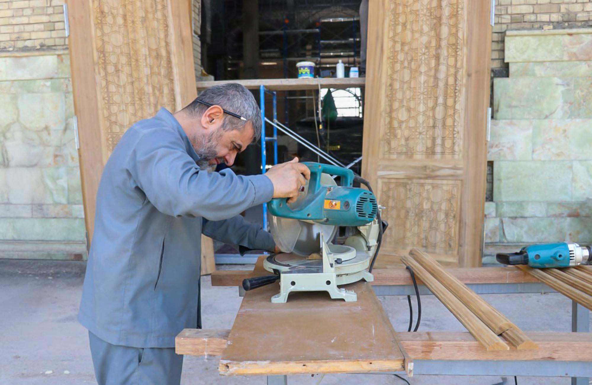 ملاكات العتبة العباسية المقدسة تنجز أعمال نصب أبواب خشبية لمرقد زيد النار في الديوانية