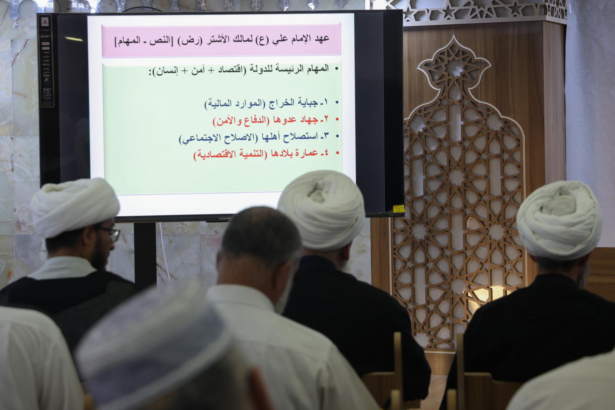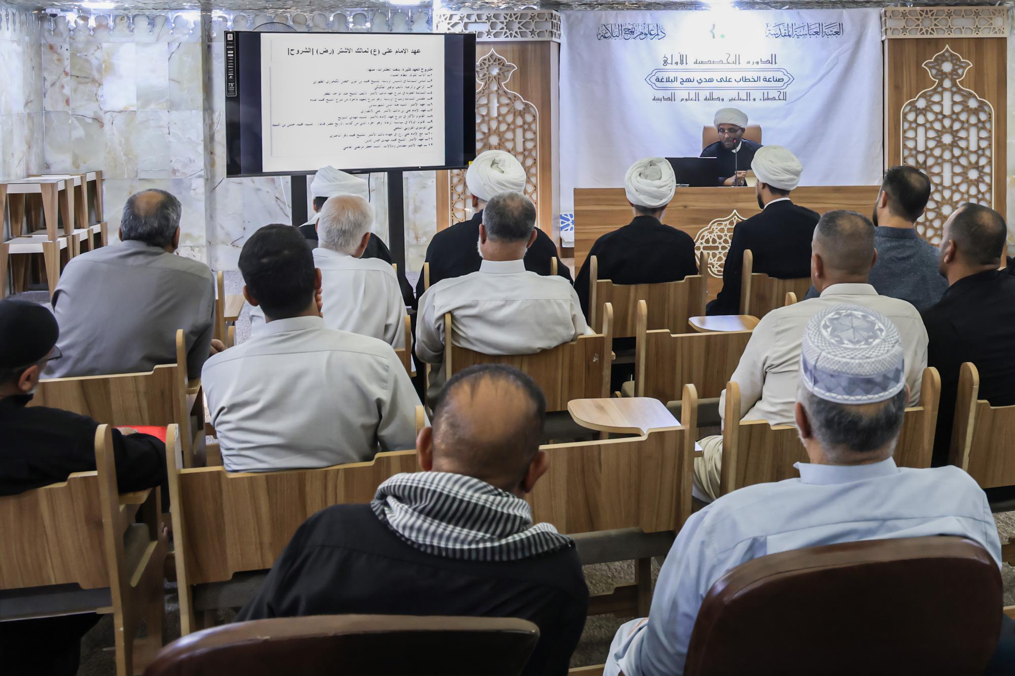 قدّمت دارُ علوم نهج البلاغة في العتبة العبّاسية المقدّسة، المحاضرة الثامنة ضمن الدورة التخصّصية الأولى لصناعة الخطاب على هدي نهج البلاغة. وقال رئيسُ الدار الدكتور لواء العطية "تواصل الدارُ تنفيذ برنامجها التدريبيّ ضمن الدورة التخصّصية (صناعة الخطاب على هدي نهج البلاغة)، حيث شهد البرنامج تقديم المحاضرة الثامنة التي تناولت عهد الإمام علي(عليه السلام) لمالك الأشتر". وأضاف، أن "المحاضرة الثامنة تناولت المحاور الرئيسة التي تعرّض لها العهدُ الشريف، فضلًا عن أهمّية العهد، ومعنى العهد في اللغة والاصطلاح". وأوضح، أن "عهد الإمام أمير المؤمنين(عليه السلام) لمالك الأشتر، يُعدّ أهمّ وثيقة إسلامية اختصّت بعلم الإدارة، والسياسة، والآداب والأخلاق الإسلامية".