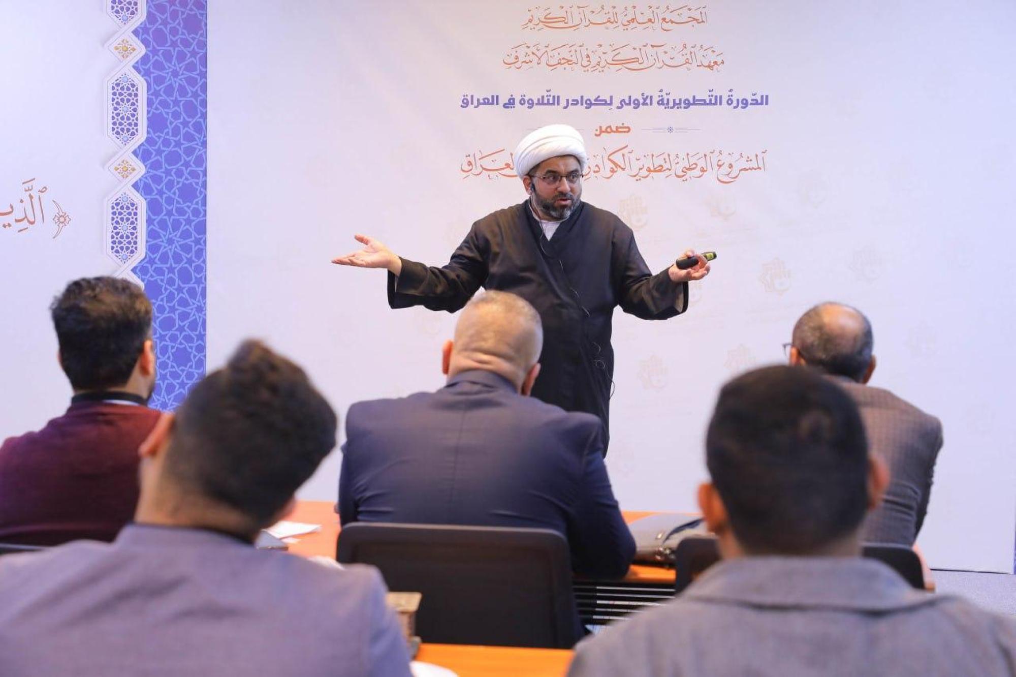 وقال مسؤول وحدة التلاوة في المعهد السيد محمد علي رشيد: إنَّ "المحاضرة الأولى في هذه الدورة، التي تستمر أربعة أيام، قدَّمها الشيخ بسيم الإدريسي بعنوان (الإدارة التسويقية للبرامج القرآنية)، وتطرَّق فيها إلى الآليات والوسائل الحديثة في الترويج للدورات والنشاطات القرآنيَّة داخل المجتمع". وبين أنَّ "الدورة موجَّهة للملاكات الإدارية القرآنيَّة المشرفة على تنظيم برامج التلاوة ونشاطاتها في تشكيلات المجمع العلمي والمؤسسات الأخرى، وتتضمن عددًا من المحاور المتعلقة بإدارة الدورات والتخطيط لها، وتسويقها، إلى جانب محاضرات توعوية يقدِّمها مجموعة من فضلاء الحوزة العلمية في النجف الأشرف، وبرامج دينية وترفيهية متنوعة". ويحرص المجمع العلمي على تطوير الوعي القرآني والفكري، وتطوير الطاقات القرآنية عبر تنظيم عددٍ من المشاريع الهادفة إلى نشر ثقافة كتاب الله العزيز في أوساط المجتمع.