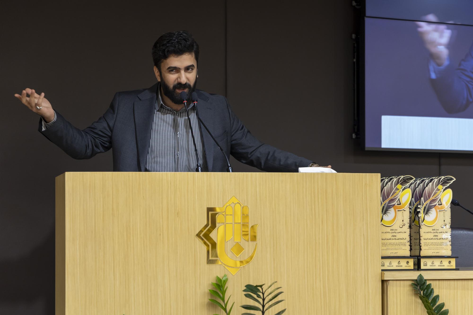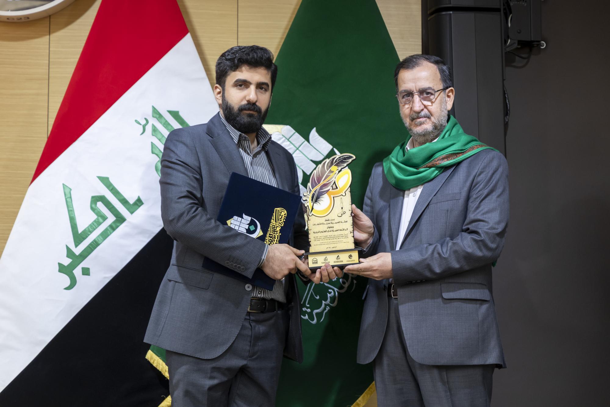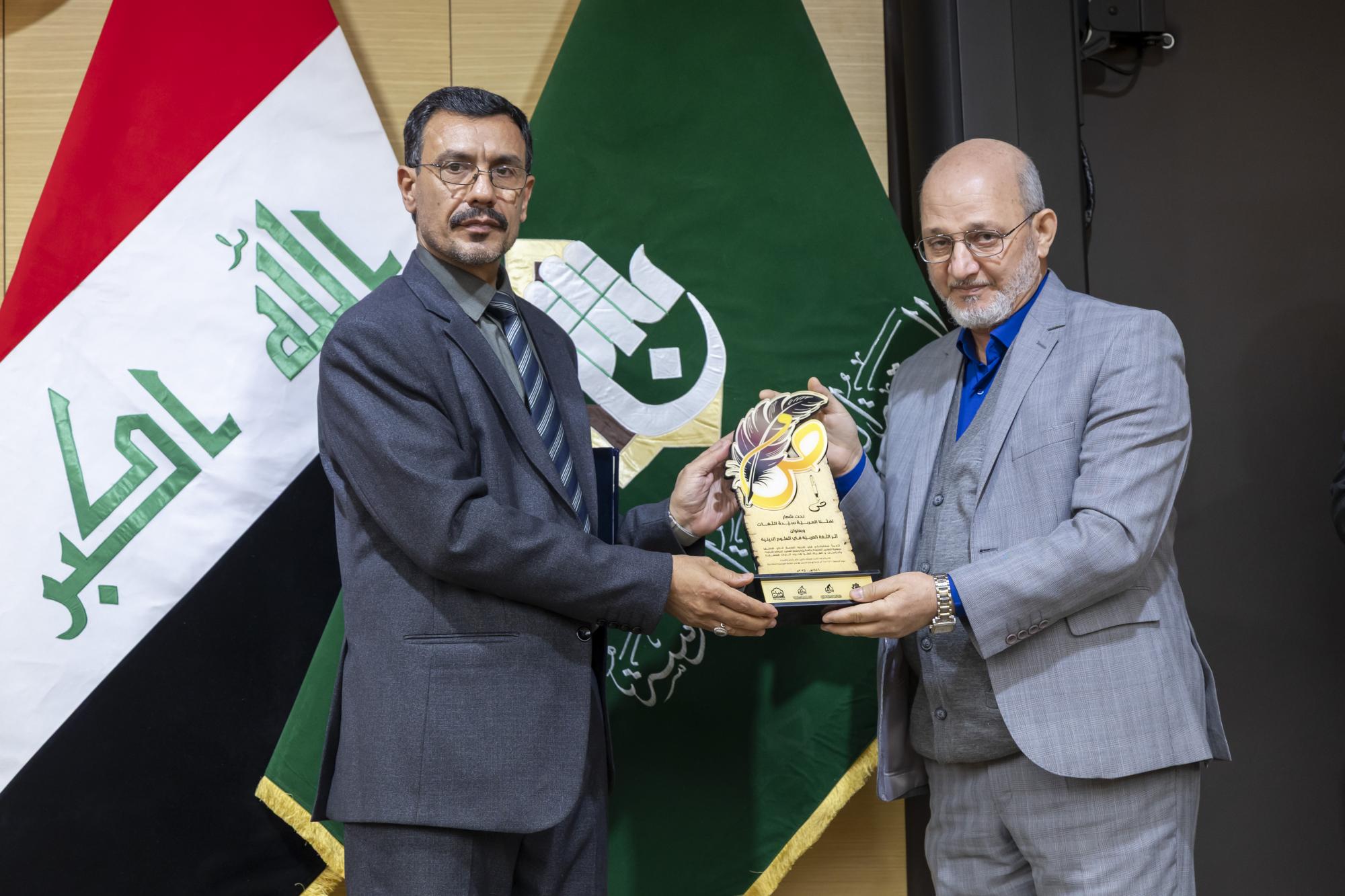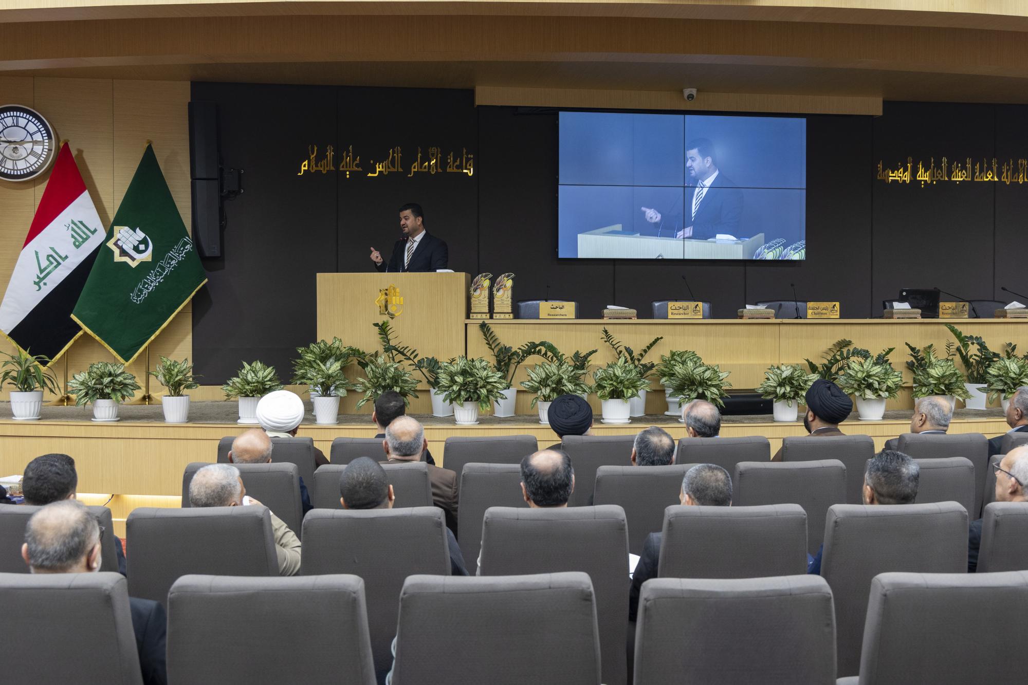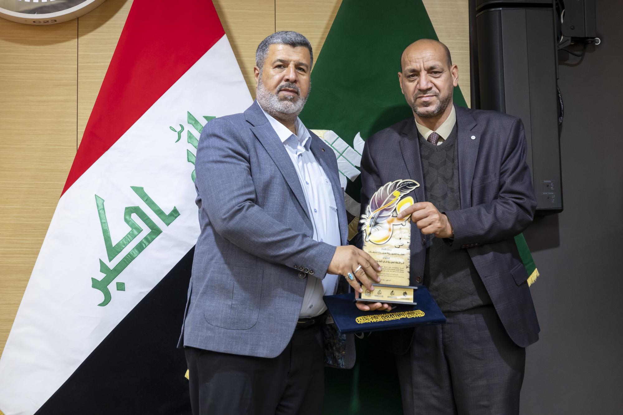 عقدت جمعية العميد العلمية والفكرية برعاية الأمانة العامة للعتبة العباسية المقدسة، ندوة علمية احتفاء باليوم العالمي للغة العربية. ونظمت الندوة الجمعية بالتعاون مع مركز العميد الدولي للبحوث والدراسات التابع لقسم الشؤون الفكرية والثقافية، والهيأة العليا لإحياء التراث في العتبة المقدسة. وأُقيمت الندوة في قاعة الإمام الحسن (عليه السلام) داخل العتبة العباسية المقدسة تحت شعار (لغتنا العربية سيدة اللغات)، وبعنوان (أثر اللغة العربية في العلوم الدينية)، وبحضور عدد من مسؤولي العتبة المقدسة إلى جانب الباحثين والمختصين. واستُهلت فعاليات الندوة بتلاوة آيات عطرة من القرآن الكريم، وقراءة سورة الفاتحة ترحمًا على أرواح الشهداء والعلماء، وقراءة النشيد الوطني ونشيد (لحن الإباء)، تلتها كلمة الأمانة العامة للعتبة المقدسة، ألقاها الدكتور سرحان جفات، وأعقبتها كلمة جمعية العميد العلمية والفكرية، ألقاها الدكتور علي المصلاوي. قال رئيس الجمعية، الدكتور رياض طارق العميدي: إنّ ندوة الاحتفاء العالمي بيوم اللغة العربية تضمنت مناقشة مجموعة من البحوث التي بيّنت أهمية اللغة العربية بوصفها الوعاء الأساسي للوعي الديني والفكري والثقافي، مشيرًا إلى أنّ الندوة ركزت على إبراز مكانة اللغة في مختلف العلوم الشرعية والفكرية. وأضاف أنّ الندوة تناولت محاور عدة، أبرزها أهمية اللغة في علوم القرآن والحديث وأصول التفسير، وتهدف إلى تعزيز مكانة اللغة العربية وتحقيق التوافق بين أصالتها والتجديد، كونها لغة حية قائمة على التطوير المستمر، مؤكدًا أنّ الندوة شهدت إلقاء عدد من التوصيات الخاصة بيوم اللغة العربية. من جانبه قال أحد ملاكات الهيأة العليا لإحياء التراث، الشيخ وسام فارس الخاقاني: إنّ دور الهيأة العليا في الندوة العلمية الخاصة بيوم اللغة العربية تمثل في التواصل مع الباحثين والأساتذة والإشراف على البحوث العلمية التي شاركت ضمن الجلسة البحثية.