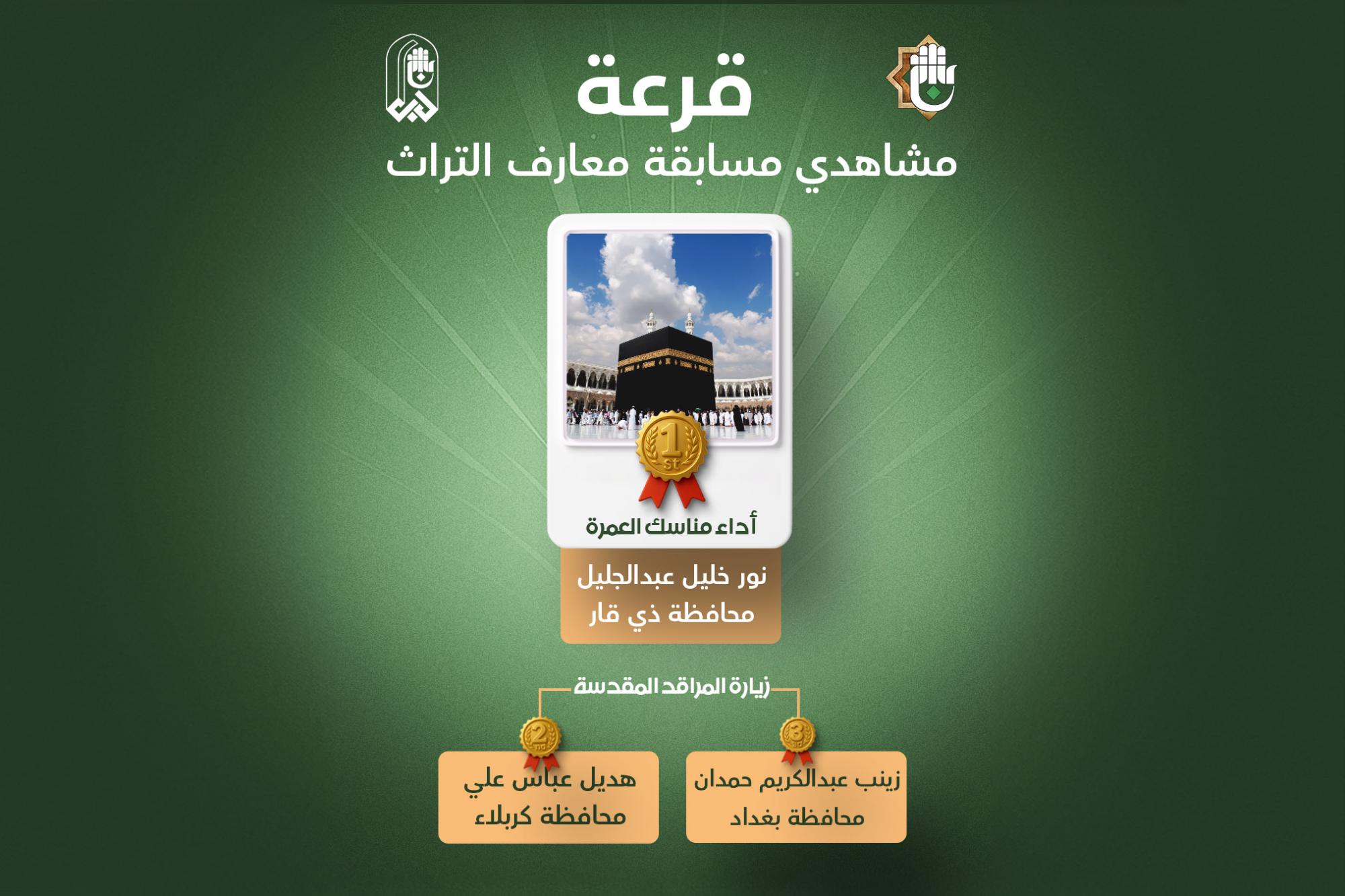أجرى قسم شؤون المعارف الإسلامية والإنسانية في العتبة العباسية المقدسة قرعته الإلكترونية الخاصة بمشاهدي (مسابقة معارف التراث) الفرقية الرمضانية لعام 1447هـ. وجاءت القرعة لاختيار الفائزين في فقرة (سؤال الجمهور)، التي تُختتم بها كل حلقة من حلقات البرنامج، إذ استقبل القسم 3018 إجابة، ووصل عدد المشاركين الذين أحرزوا الإجابات الكاملة عن جميع أسئلة الحلقات العشرين إلى 60 مشاهدًا. وأسفرت القرعة عن فوز ثلاثة مشاركين لزيارة الأماكن المقدسة، وهم: نور خليل عبد الجليل / محافظة ذي قار (الفائزة الأولى). هديل عباس علي / محافظة كربلاء (الفائزة الثانية). زينب عبد الكريم حمدان / محافظة بغداد (الفائزة الثالثة).