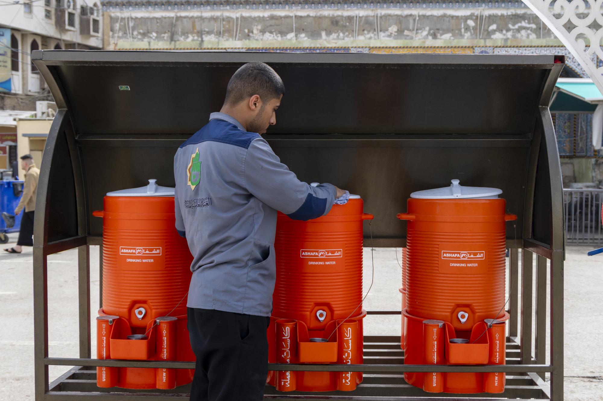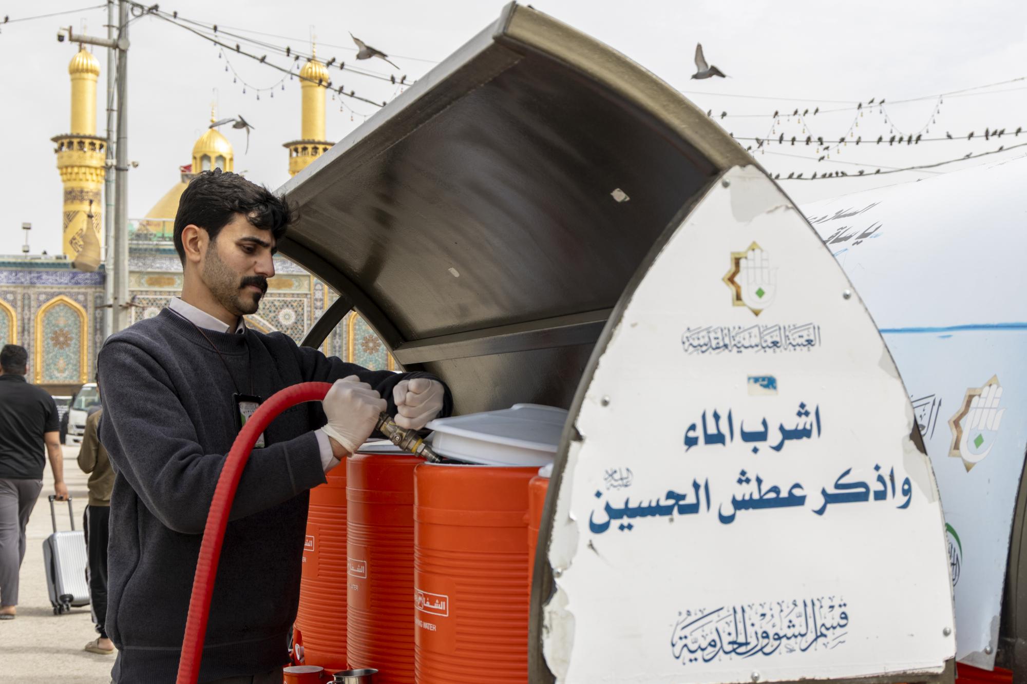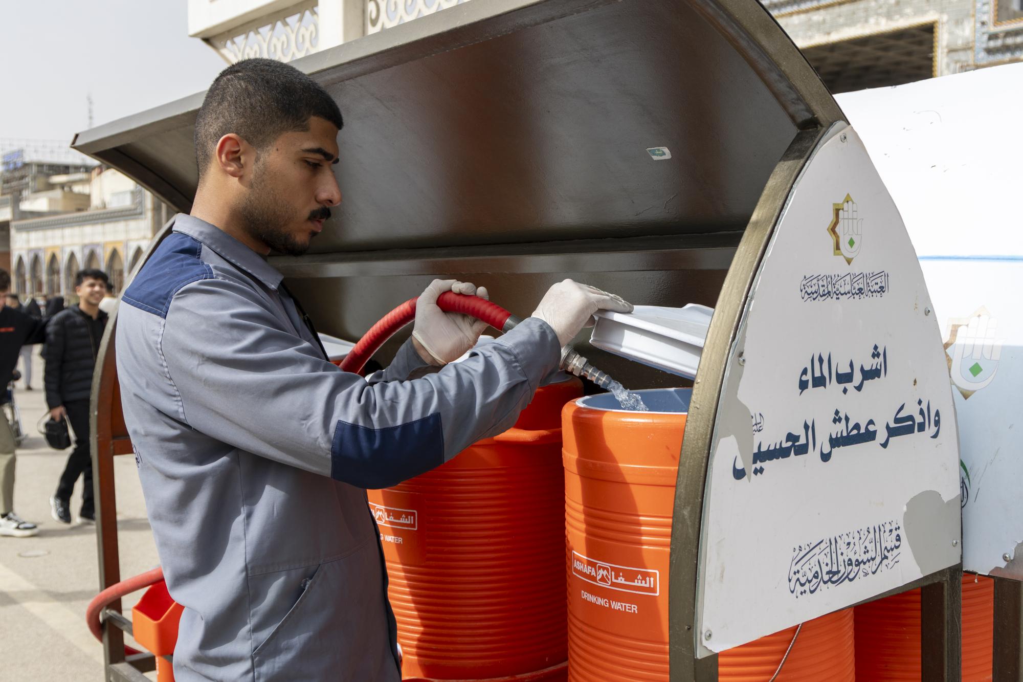 يواصل قسم الشؤون الخدمية في العتبة العباسية المقدسة تنفيذ خططه الخدمية الساعية إلى خدمة الزائرين الوافدين إلى مرقد أبي الفضل العباس (عليه السلام). وتبذل ملاكات شعبة السقاية التابعة للقسم جهودًا ميدانية متواصلة، إذ تنتشر فرقها في محيط المرقد الطاهر وعلى الطرق المؤدية إليه، لضمان وصول الماء إلى أكبر عدد ممكن من الزائرين، ولاسيّما في أوقات الذروة التي تشهد توافدًا كبيرًا. وتعتمد الشعبة آليات عمل مرنة تواكب زيادة أعداد الزائرين، عبر نشر عجلات مخصصة لنقل الماء، إلى جانب نقاط توزيع ثابتة.