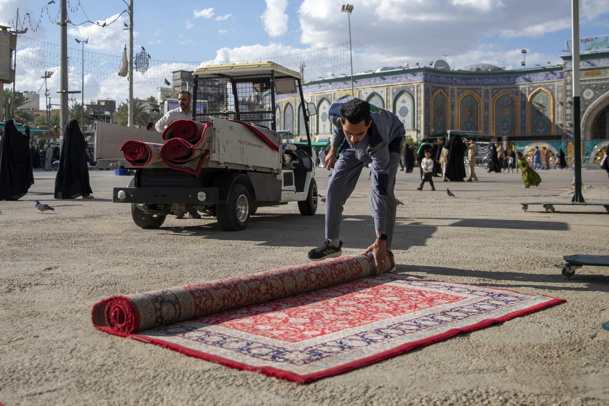 يقدّم قسمُ الشؤون الخدمية في العتبة العبّاسية المقدّسة، خدماتٍ عديدة لزائري مرقد أبي الفضل العباس(عليه السلام)، في ليلة الجمعة المباركة. يأتي ذلك عبر تنفيذ مجموعةٍ من الأعمال الخدمية التي تهدف إلى توفير الأجواء المناسبة للزائرين، منها: فرش السجاد في عددٍ من المداخل والساحات المحيطة بالمرقد الطاهر.