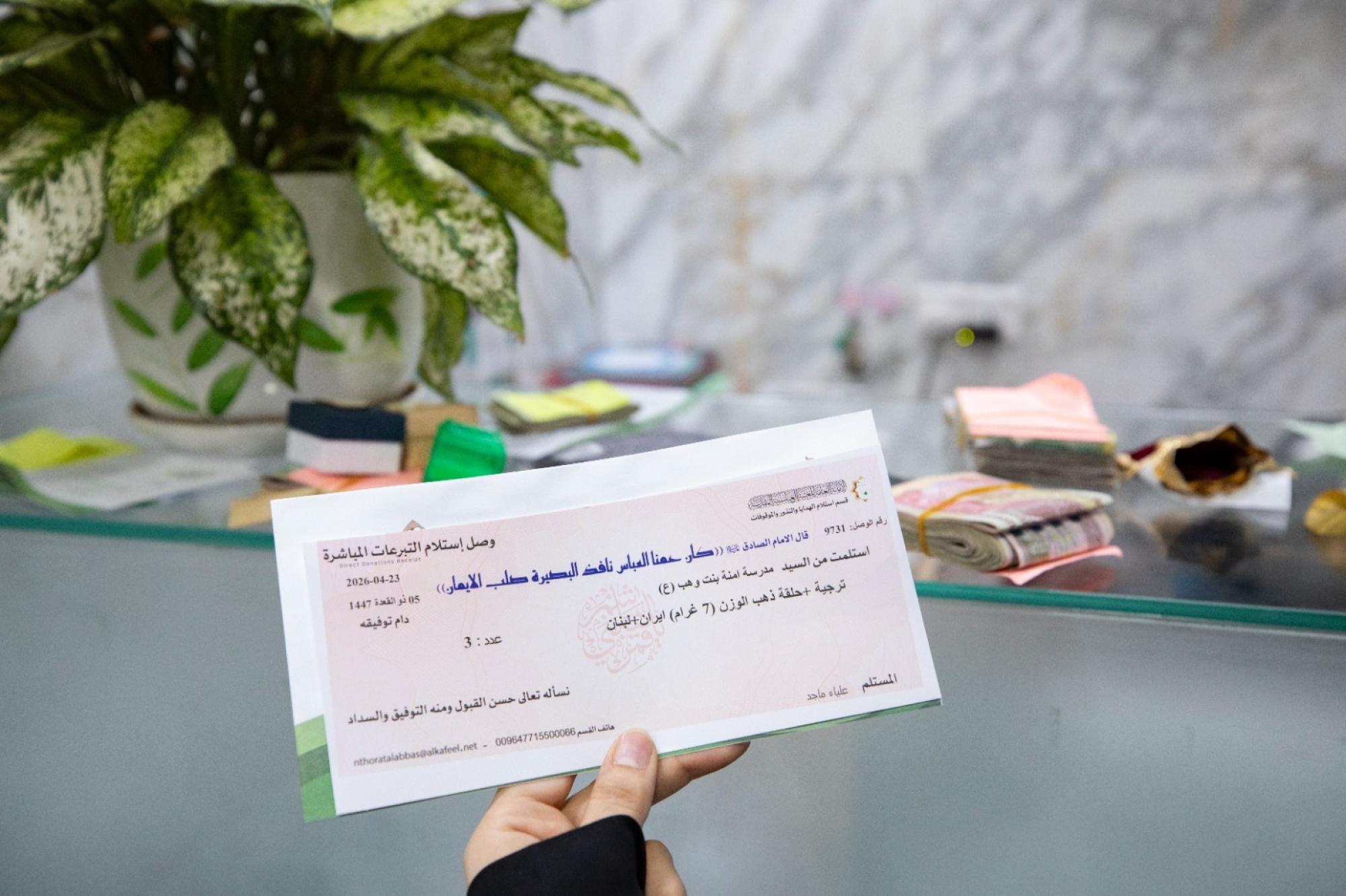 وتُستلم التبرعات داخل الصحن الشريف عبر عدد من المنافذ للرجال والنساء، وهي: منفذان لقسم استلام الهدايا والنذور والموقوفات، الأول يقع مجاور باب الإمام الحسن (عليه السلام)، والثاني مجاور باب العلقمي، ومنفذ قسم الشؤون الدينية المجاور لباب الإمام الحسين (عليه السلام)، إضافة إلى منفذ وحدة الهدايا والنذور للزائرات قرب باب الإمام محمد الجواد (عليه السلام) المخصص للنساء.