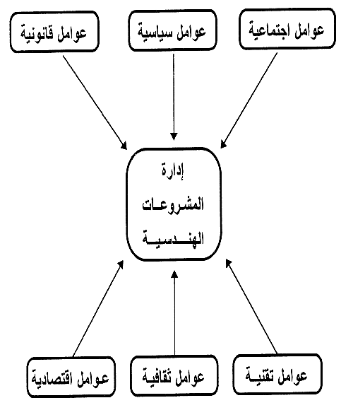 هناك عوامل هامة وعديدة تؤثر على العملية الإدارية بشكل عام مثل: عوامـل اجتماعية، سياسية، قانونية، تقنية، ثقافية واقتصادية (شكل 1). هذه العوامل تحتاج إلى دراسة وافية كي يتم اختيار أسلوب الإدارة الذي يتناسب إلى حد ما مع الظروف المحيطة بحيث يؤدي في النهاية إلى تحقيق أهـداف الشركة أو المؤسسة. إدارة المشاريع الإنشائية هي أحد العلوم الحديثة التي ظهرت في السنوات الأخيرة نتيجة للحاجة الماسة لفـن يستند إلى التقنية العلمية لتنظيم الجهود الإنسانية والمواد لتنفيذ المشاريع. فالإدارة هي فن توجيه جهود العاملين للحصول منهم على إنتاجية عالية وجودة مرتفعة مما يعمل على تفادي الخسارة وزيادة الأرباح.