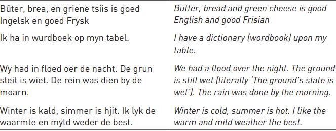 From the language family tree, it can be seen that English is ‘genetically’ (the use of this biological metaphor is common in describing the relationships between languages) part of the West Germanic branch, and that its closest relative is Frisian, a language spoken in the north-west Netherlands, which has recognized minority language status and its own language academy (Fryske Akademy, founded in 1938). The close family relationship between the two languages should not be taken too literally: they have diverged from each other considerably and have had very different contact histories. English vocabulary was hugely influenced by Norman French as a result of the Norman conquest of 1066, while the Frisian language has seen extensive lexical borrowing from Dutch. But nonetheless, close similarities to English are still evident in the following examples, taken from the Virtual Linguist website: