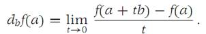 Note that the difference quotient in the definition is taken by subtracting f(a) from the value of f taken on the line segment in RN joining a and a + b. The second directional derivative of f in the direction b at the point a is simply db[dbf ](a), and it is denoted b (db)2f(a). The nth directional derivative, (db)nf(a), is defined similarly.